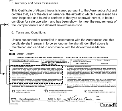With the exception of hang gliders and ultra-lights, aircraft must have authority to fly (flight authority), and this authority is provided by Transport Canada is the form of a Certificate of Airworthiness.