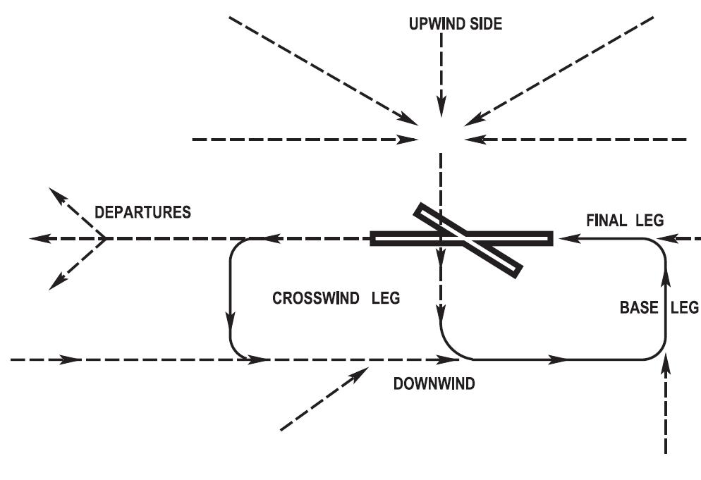 Traffic circuits (referred to as “traffic patterns” in the U.S.) are standard patterns located 1000’ AGL (above ground level) flown by aircraft for the purposes of landing and taking off. They are composed of two sides: downwind and upwind. In a standard circuit, the downwind side is the active side, while the upwind side is the “dead” side. The active side is comprised of four “legs”: crosswind leg, downwind leg, base leg, and final.