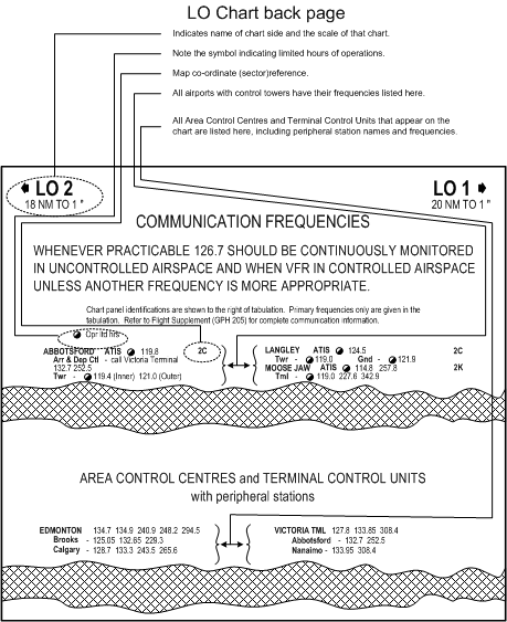 On back page of the LE are two blocks of information, the first concerning the VHF frequencies assigned to each of the major airports on the chart with control towers (including ATIS, Tower and Ground frequencies), and the second concerning the Area Control Centre and Terminal Control VHF frequencies, including peripheral station radio frequencies.
