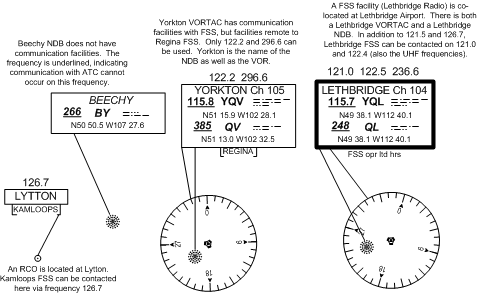 The radio aid data boxes are virtually identical to the pattern used on VFR charts. A heavy line around the navigation aid data box indicates the facility is co-located with FSS. In the case a thin-lined box, FSS is not co-located with the facility. Remote FSS communication equipment is established at many radio aid sites, and these are indicated by the appearance of a sub-box below the navigation aid data box.