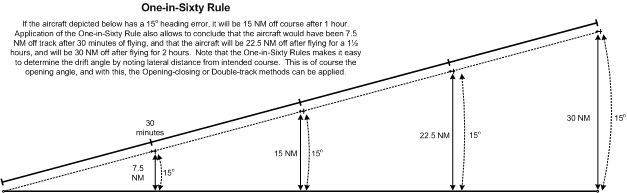 The One-in-Sixty Rule holds that a 1° error in course will result in the aircraft being 1 NM off course after travelling 60 miles off course.