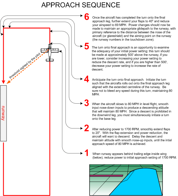 Success at landing is firmly rooted in your ability to develop a standardized approach pattern or profile. If you ensure that the approach is conducted the same way every time, then you will develop an ability to predict the outcome of the approach—it will become easy to make sense of the pitch, power, and flap changes insofar as their effect on the approach profile. Repetition and standardization is the key, then, and you want to develop this as soon as possible.2 Below, again, is the standardized approach applied by Langley Flying School Instructors. Note the detail in power settings, flap setting, and airspeeds. Note also the start of the approach—the approach sequence begins in the downwind leg when the runway threshold appears behind the trailing edge of the inside wing (usually the left wing in a left-hand circuit).