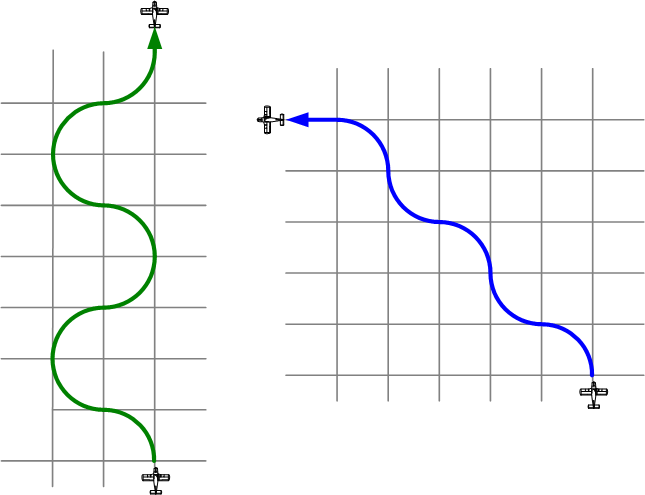 After checking adjacent airspace for additional traffic, establish the aircraft in straight and level flight at 90 MPH. Align the aircraft with reference to the street/avenue grid, and then initiate a 45° bank turn at or within the Flight Test limits for steep turns. When the turn rotates the heading through the one-quarter turn point (45° heading change), roll the aircraft in the opposite direction to perform a switchback leading to a 45° bank turn in the opposition direction. Repeat sufficiently to establish a smooth and precise performance of the switchback.