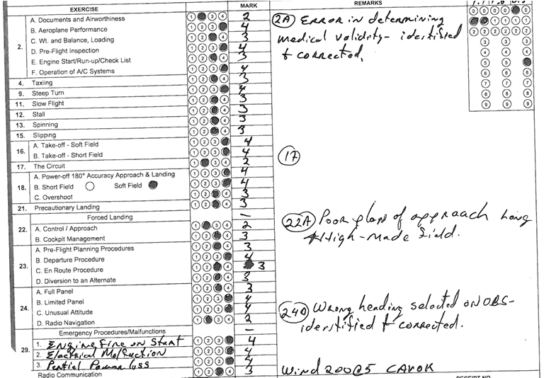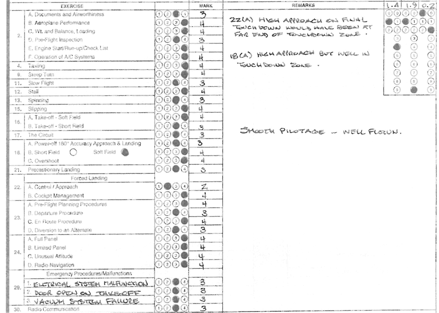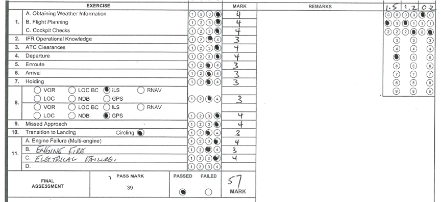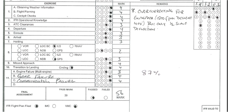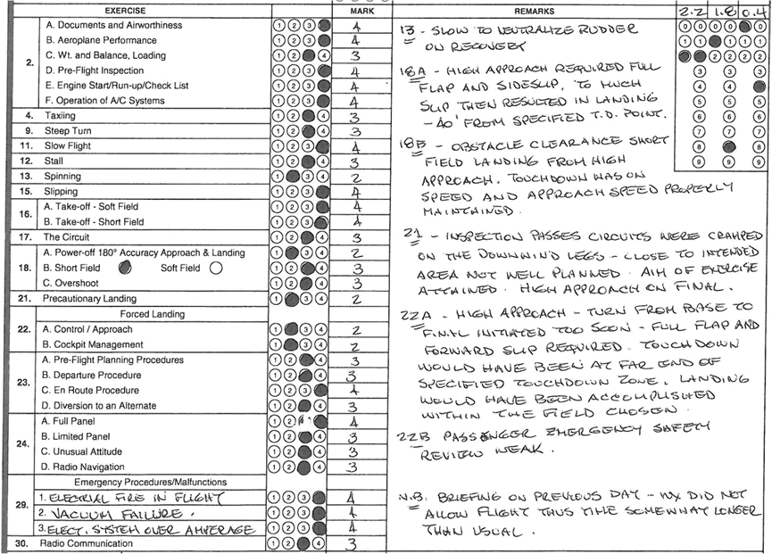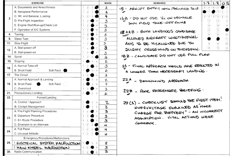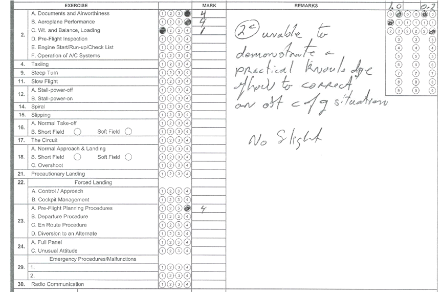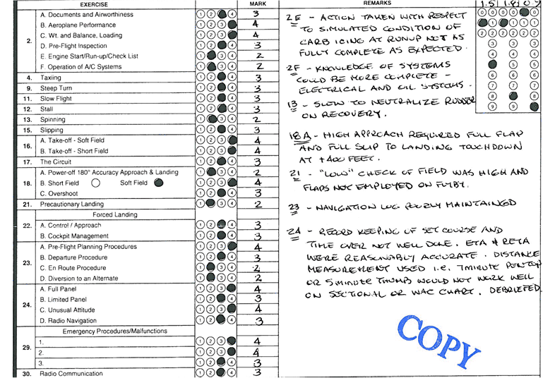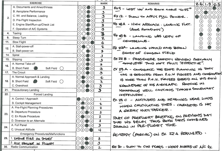 The collection of Flight Test Report samples below are derived from actual flight test results, so you will be reading raw Pilot Examiner notes. The idea, of course, is for you to read the comments of the examiner with the idea that you will know not to display in your own flight test. Unfortunately, the examiner comments are abridged and do not shed a lot of light on what occurred, but there should be enough information for you to get a sense of their general thinking leading to the mark-down. Remember that comments are only provided for scores of 2 or lower (i.e., 1). Therefore, when a candidate does well on an exercise, there will not be any more information other than the score of 3 or 4.