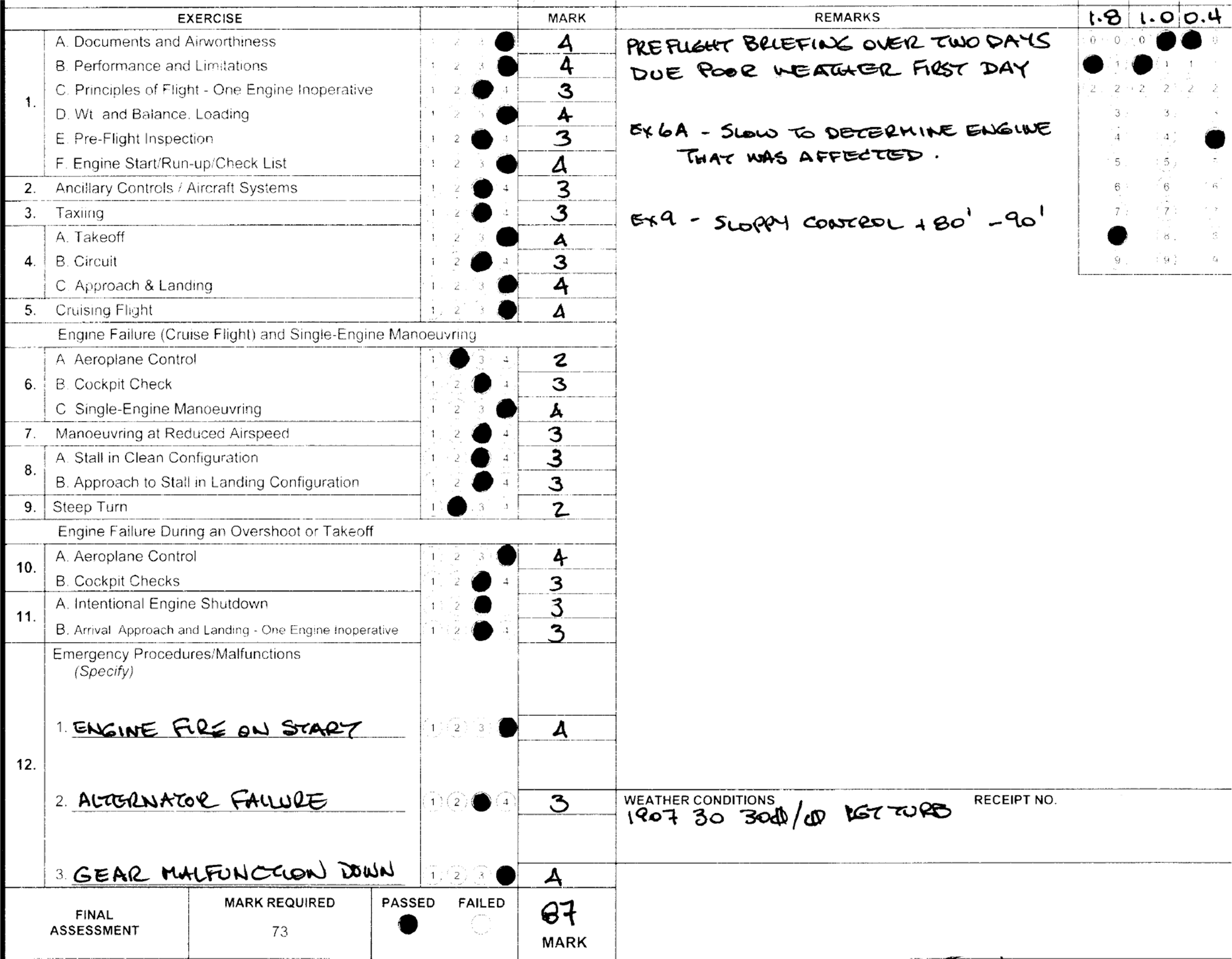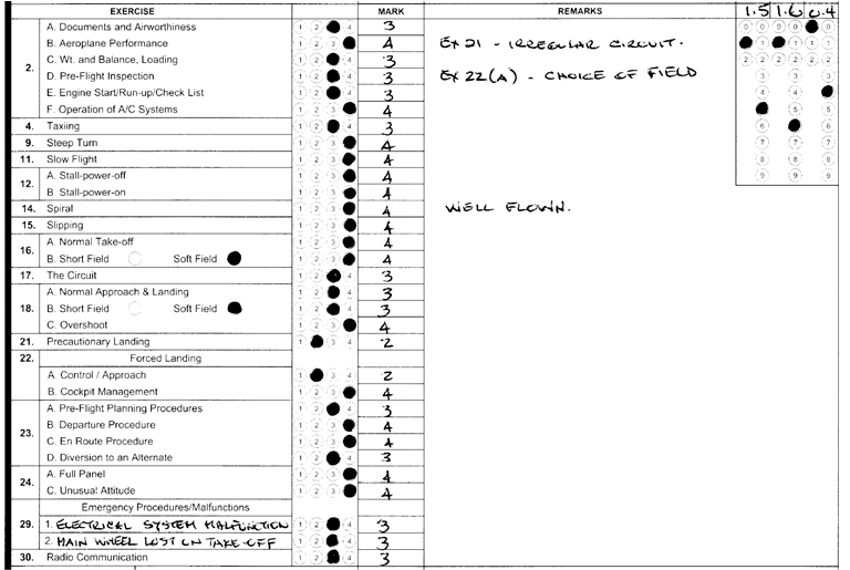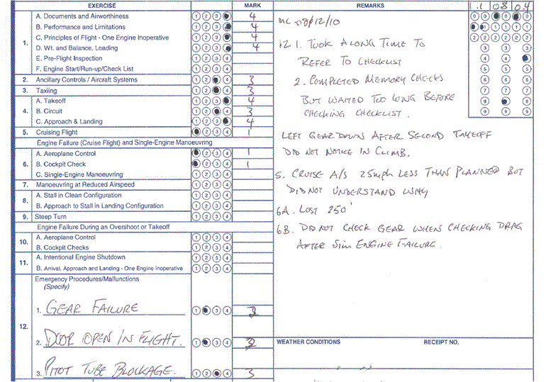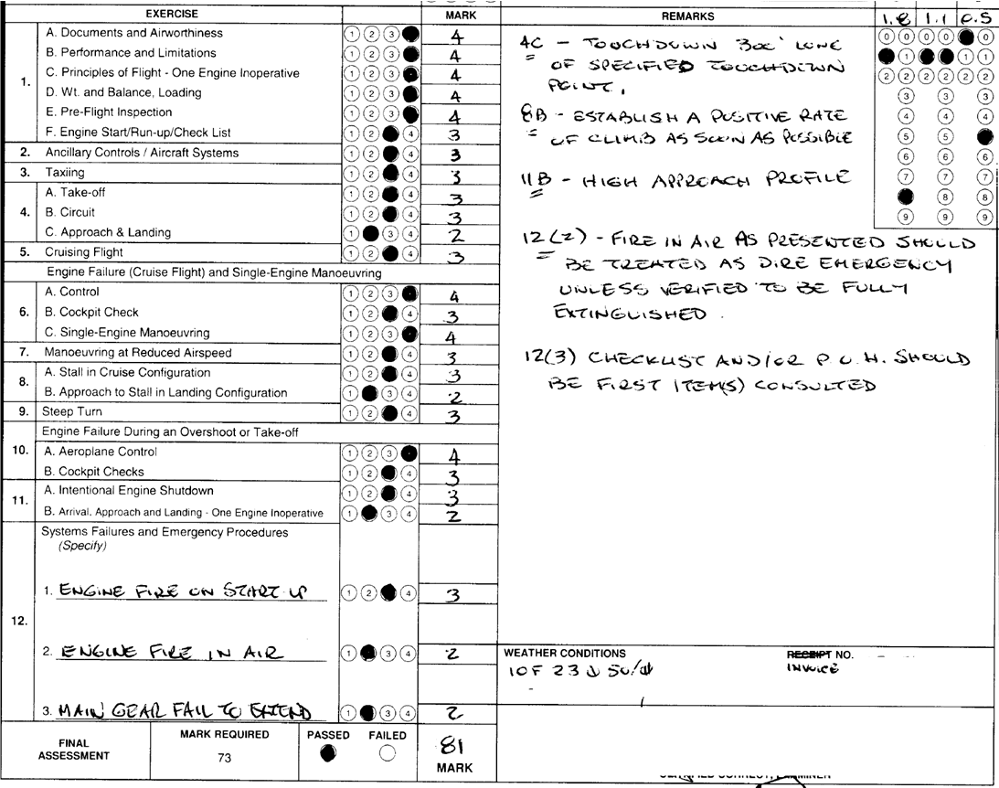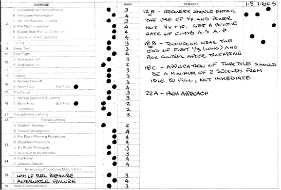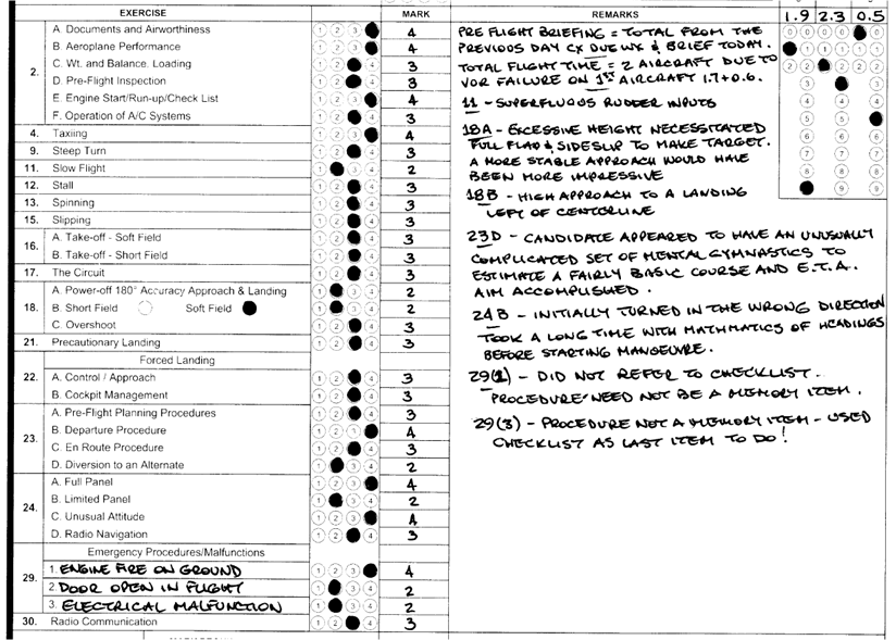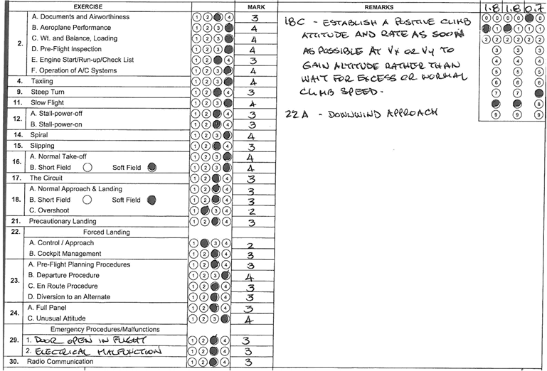 The collection of Flight Test Report samples below are derived from actual flight test results, so you will be reading raw Pilot Examiner notes. The idea, of course, is for you to read the comments of the examiner with the idea that you will know not to display in your own flight test. Unfortunately, the examiner comments are abridged and do not shed a lot of light on what occurred, but there should be enough information for you to get a sense of their general thinking leading to the mark-down. Remember that comments are only provided for scores of 2 or lower (i.e., 1). Therefore, when a candidate does well on an exercise, there will not be any more information other than the score of 3 or 4.
