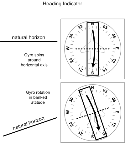 The HI gyro spins around a horizontal axis and provides aircraft heading information; it is set to the aircraft compass.