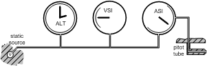 Of the flight instruments which make use of the pitot-static system—the airspeed indicator (ASI), the vertical speed indicator (VSI), and the altimeter (ALT), only the ASI is connected to both pressure sources.