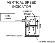 The final pitot-static instrument is the VSI, which indicates the vertical speed of the aircraft—i.e., the vertical component of the aircraft’s flight path—in hundreds of feet per minute. The sealed instrument case is connected to static pressure by way of a calibrated leak—i.e., a “slow bleeding” leak referred to as a restricted diffuser. Inside the case is a diaphragm that flexes in response to the pressure changes associated with a change in altitude; when the aircraft levels off, the diffuser equalises the pressures on either side of the diaphragm causing the instrument readings to go to zero. The diffuser is designed to equalise pressures in approximately six to nine seconds.
