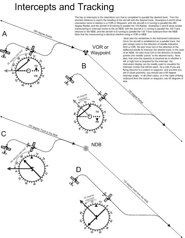 The intercept angles used are the same (unless otherwise prescribed): a 45° angle is used when intercepting a track from a station (radio navigation aid), and a 90° angle is used when intercepting a track to a station.
