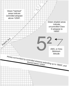 Note carefully the Legend that appears on LE charts. On the bottom right-hand corner of the Legend—under Miscellaneous—we are told that all green-shaded areas of the Chart indicate uncontrolled airspace below 18000’ ASL, while the white areas indicate controlled airspace below this altitude, including Low Level Airways, and Transition Areas. The Chart further delineates areas where controlled airspace exists above 12500’ ASL (Low Level Airways and Control Area Extensions)—all green areas patterned with white square (with green shade) hatching. Finally, note under this section is the description of isogonic lines (darker green and dashed). Note also the Area Minimum Altitudes (AMAs), which provides 2000’ clearance over the obstacle within the quadrantal (established by degrees longitude and latitude).
