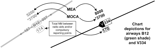 Perhaps the most important information on the LE for the IFR pilot is the MOCA (Minimum Obstruction Clearance Altitudes), which is marked with an asterisk, and MEA (Minimum En Route Altitudes), which lack an asterisk (see depiction below).